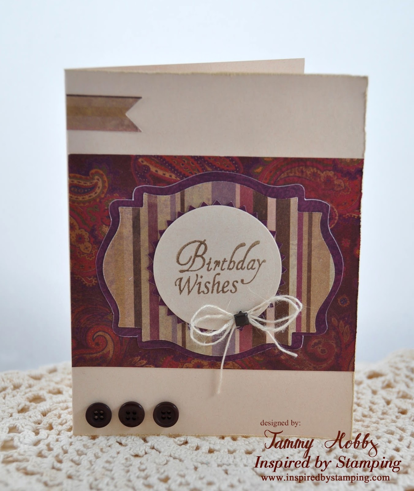 A length of seam binding was wrapped around the upper portion of the card front and tied in a fussy bow and tied off using a button, twine and a tag stamped with a darling heart from the Giddy Bug set. The star of the show is the cute Giddy Bug herself! :-))) She has been colored in with pink copics and her cute friend the butterfly has been embellished with a yellow button and twine.